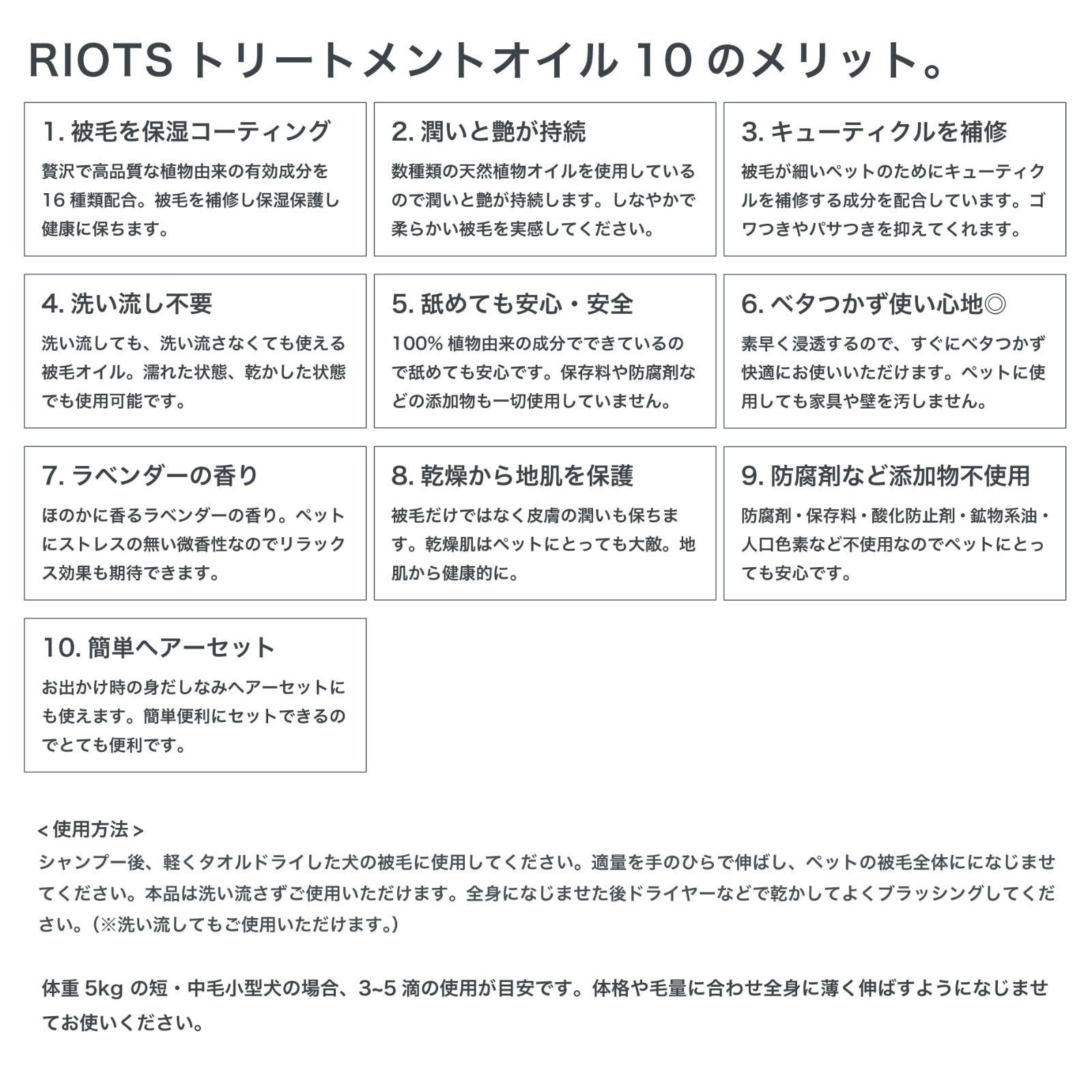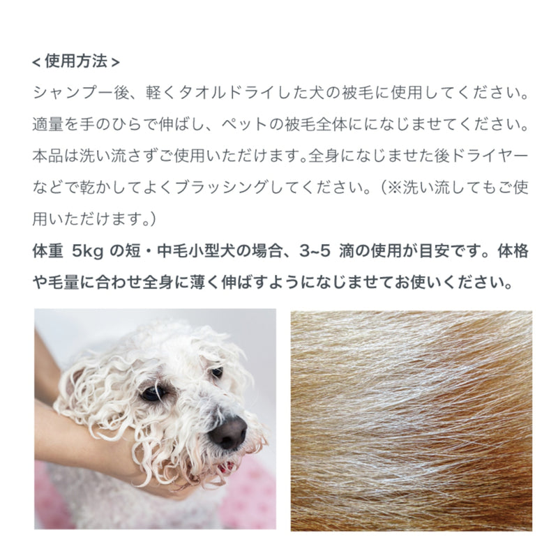 体格や毛量に合わせ全身に薄く伸ばすように馴染ませてお使いください。