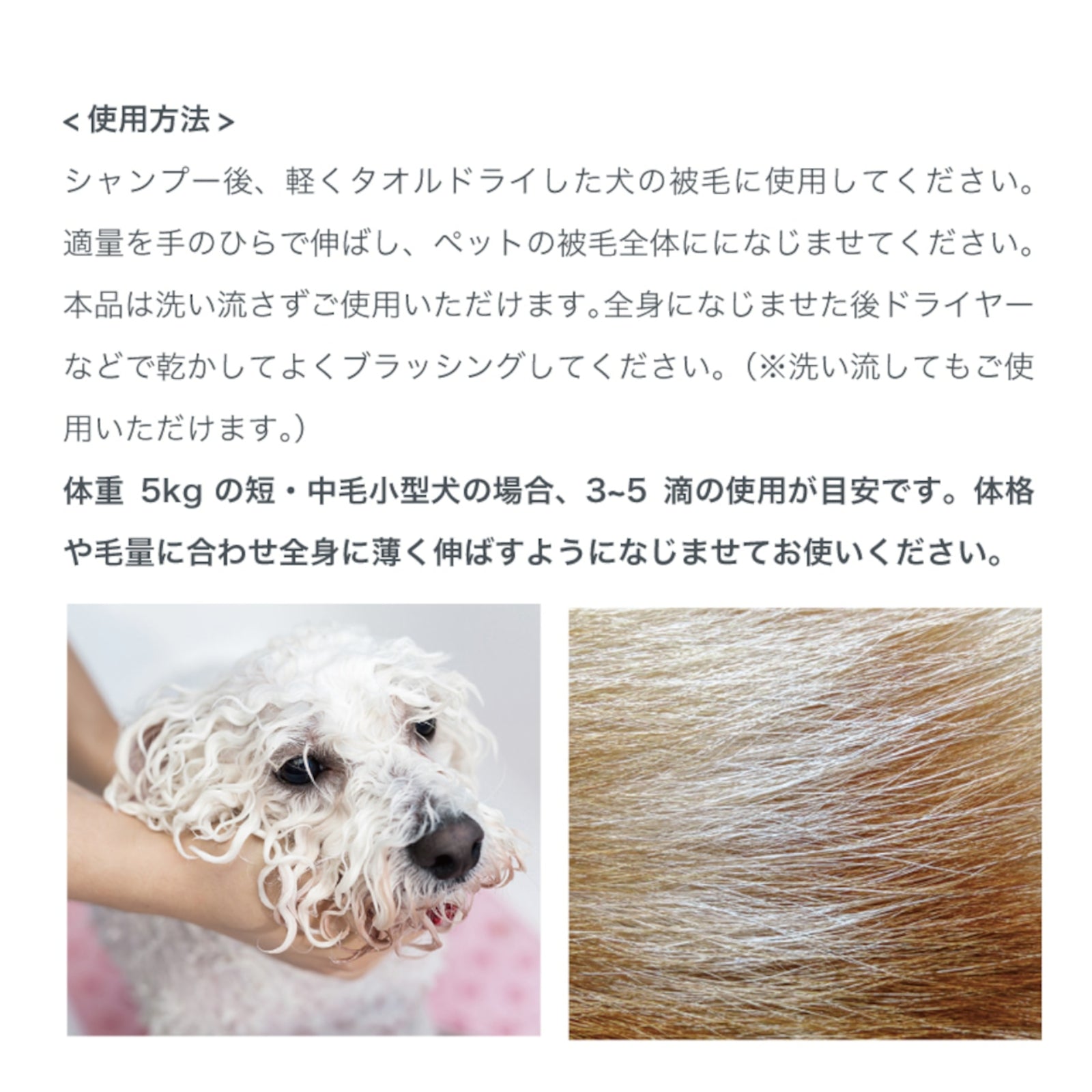 シャンプー後、軽くタオルドライした犬の被毛に使用してください。