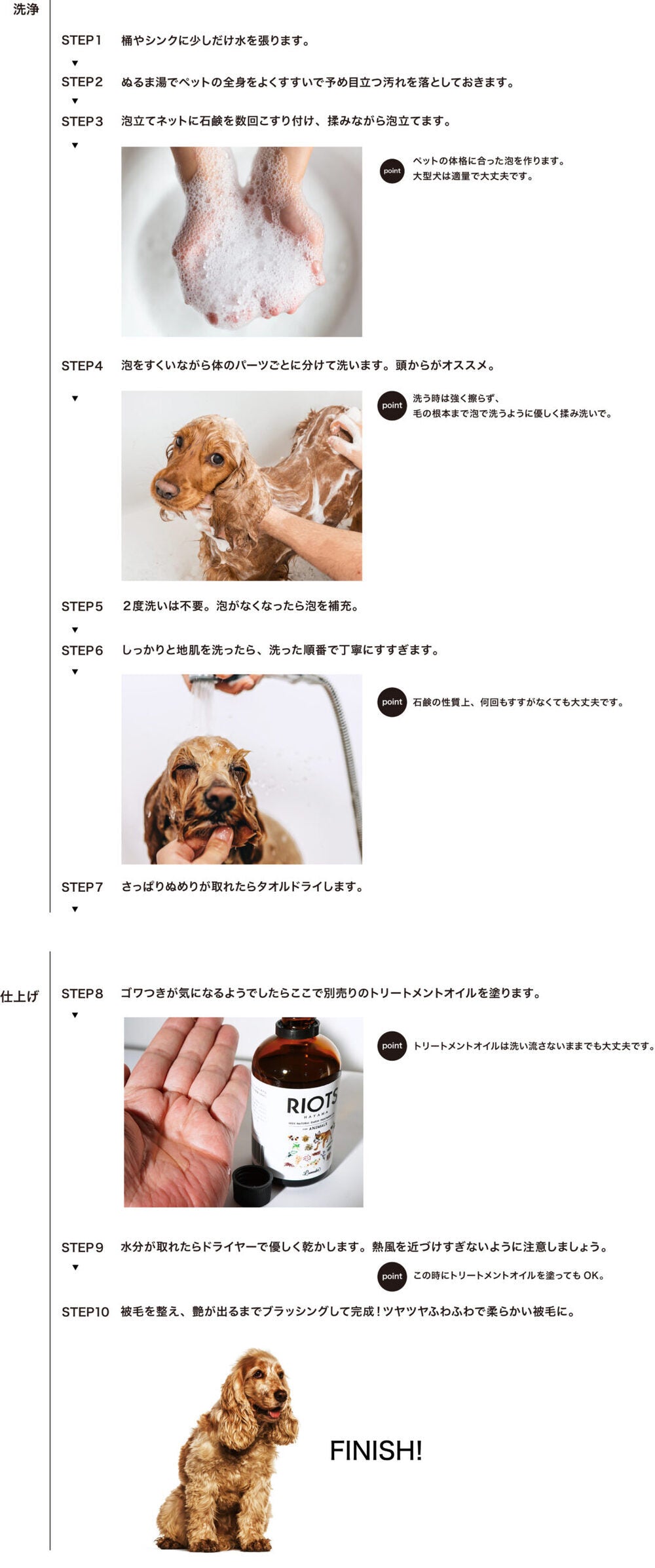 全身になじませた後ドライヤーなどで乾かしてよくブ ラッシングしてください。