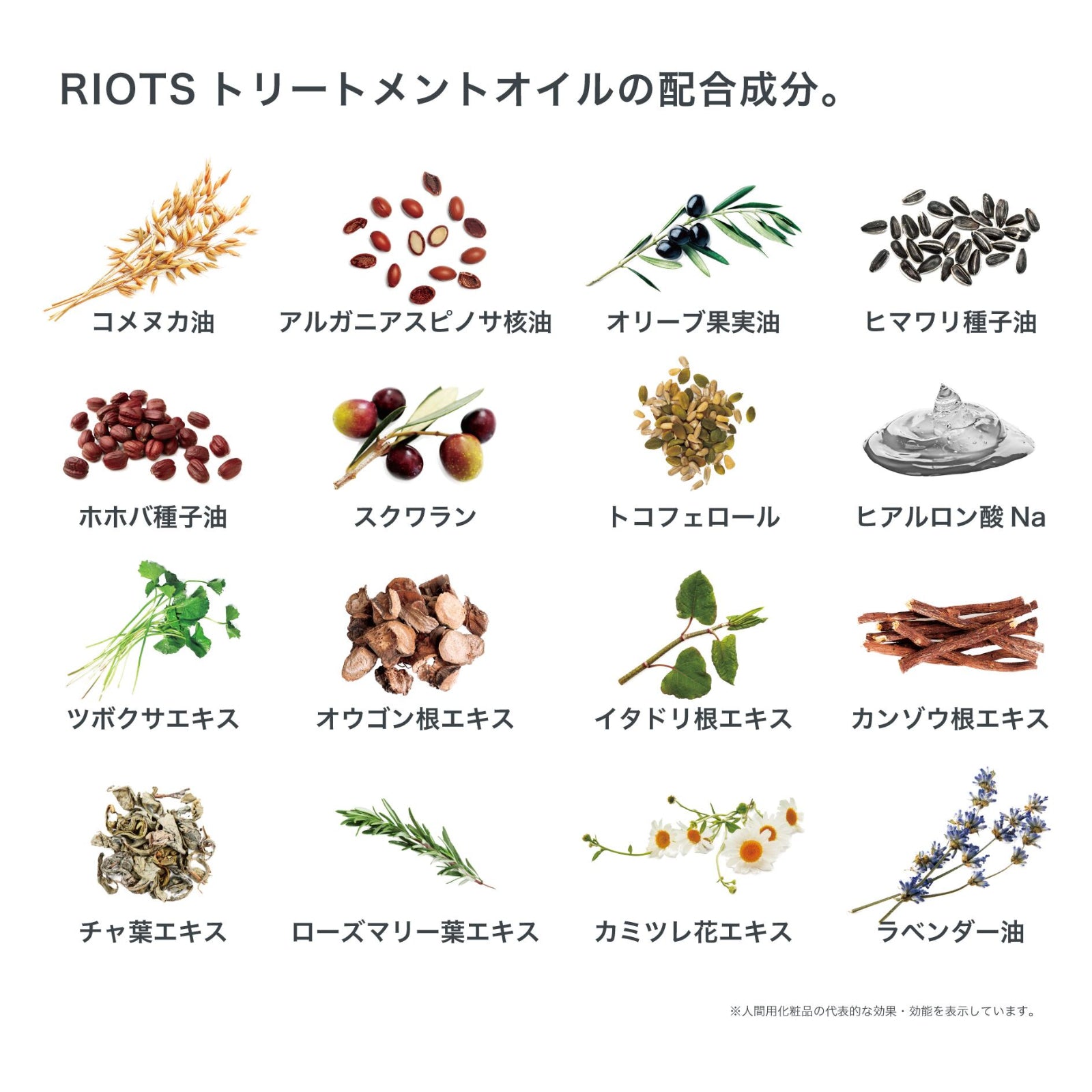 コメヌカ油、アルガニアスピノサ核油、 オリーブ果実油、ヒマワリ種子油、ホホバ種子油、 スクワラン、トコフェロール、ヒアルロン酸Na、 ツボクサエキス、オウゴン根エキス、イタドリ根エキス、カンゾウ根エキス、 チャ葉エキス、ローズマリー葉エキス、カミツレ花エキス、ラベンダー油